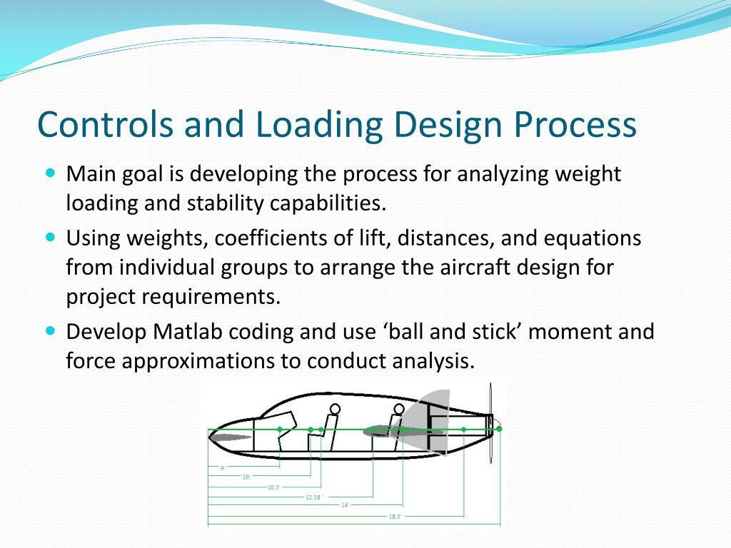 Controls and Loading Design Process • Main goal is developing the process for analyzing weight loading and stability capabilities. • Using weights, coefficients of lift, distances, and equations from individual groups to arrange the aircraft design for project requirements. • Develop Matlab coding and use ‘ball and stick’ moment and force approximations to conduct analysis.