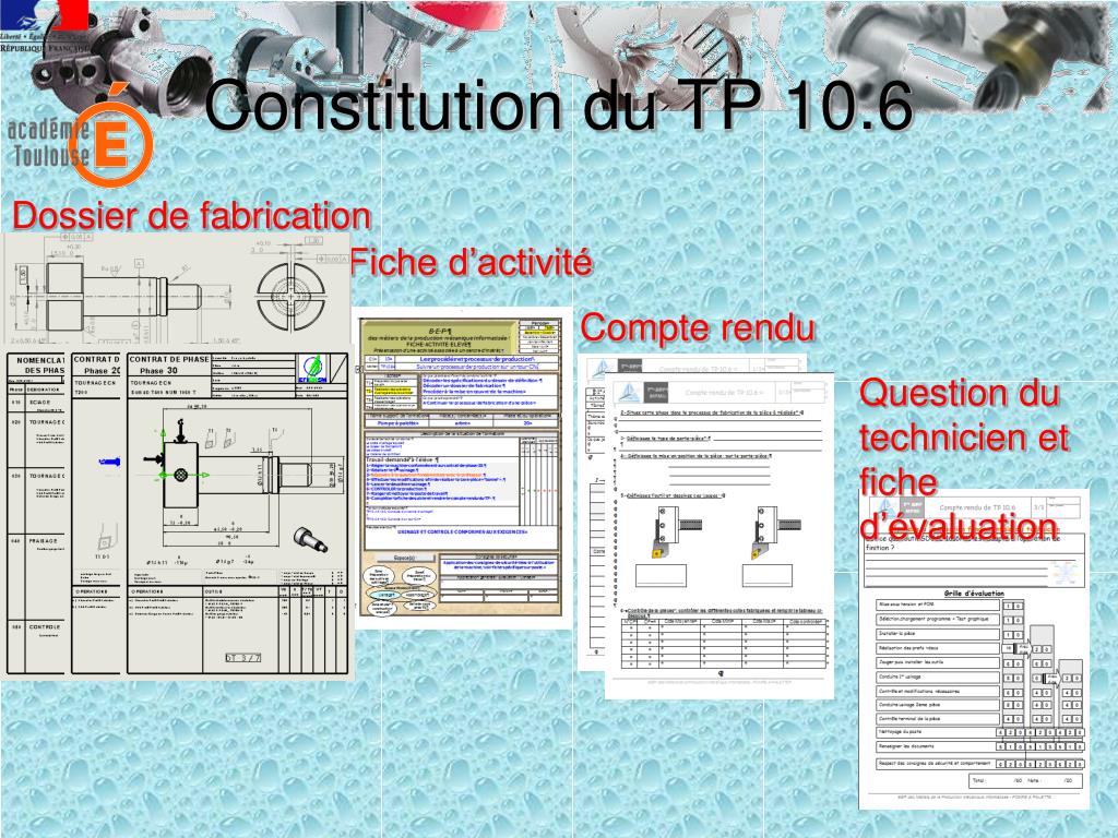 Constitution du TP 10.6 Dossier de fabrication Fiche d’activité Compte rendu Question du technicien et fiche d’évaluation