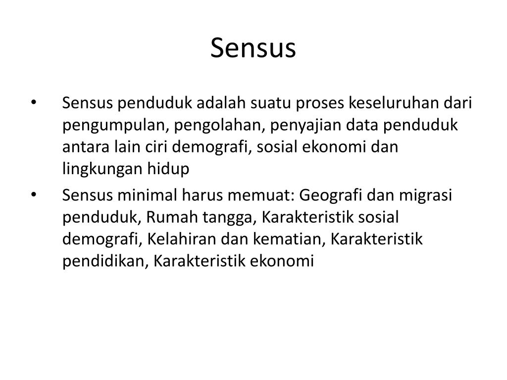 Sensus • Sensus penduduk adalah suatu proses keseluruhan dari pengumpulan, pengolahan, penyajian data penduduk antara lain ciri demografi, sosial ekonomi dan lingkungan hidup • Sensus minimal harus memuat: Geografi dan migrasi penduduk, Rumah tangga, Karakteristik sosial demografi, Kelahiran dan kematian, Karakteristik pendidikan, Karakteristik ekonomi