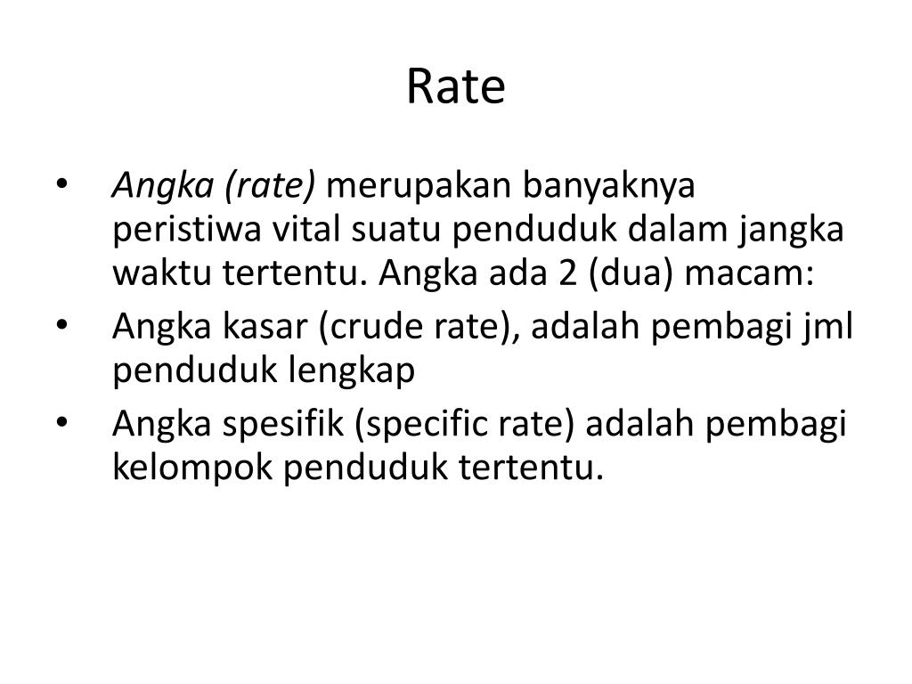 Rate • Angka (rate) merupakan banyaknya peristiwa vital suatu penduduk dalam jangka waktu tertentu. Angka ada 2 (dua) macam: • Angka kasar (crude rate), adalah pembagi jml penduduk lengkap • Angka spesifik (specific rate) adalah pembagi kelompok penduduk tertentu.