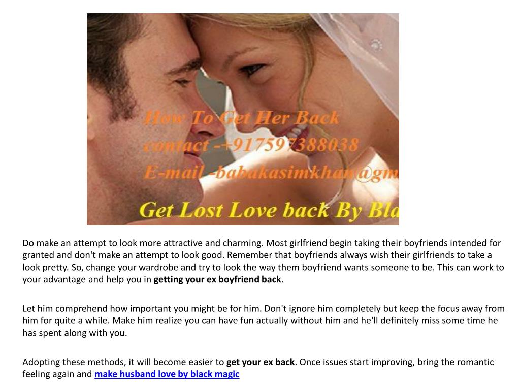 Do make an attempt to look more attractive and charming. Most girlfriend begin taking their boyfriends intended for granted and don't make an attempt to look good. Remember that boyfriends always wish their girlfriends to take a look pretty. So, change your wardrobe and try to look the way them boyfriend wants someone to be. This can work to your advantage and help you in getting your ex boyfriendback. Let him comprehend how important you might be for him. Don't ignore him completely but keep the focus away from him for quite a while. Make him realize you can have fun actually without him and he'll definitely miss some time he has spent along with you. Adopting these methods, it will become easier to get your ex back. Once issues start improving, bring the romantic feeling again and make husband love by black magic
