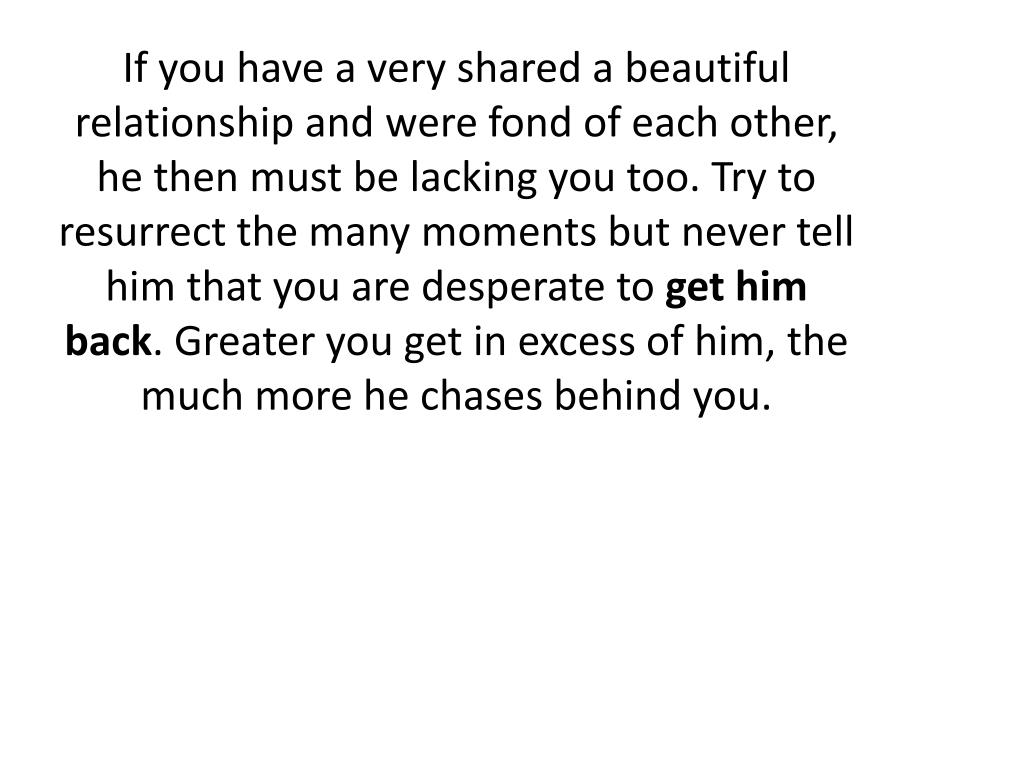 If you have a very shared a beautiful relationship and were fond of each other, he then must be lacking you too. Try to resurrect the many moments but never tell him that you are desperate to get him back. Greater you get in excess of him, the much more he chases behind you.