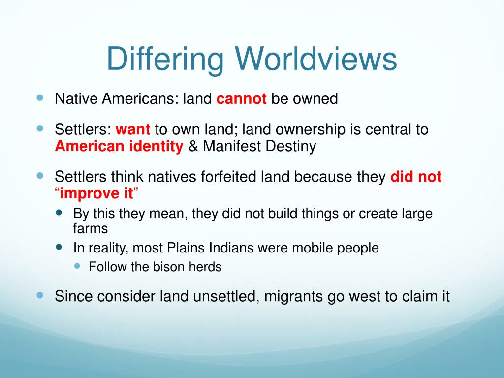 Differing Worldviews • Native Americans: land cannot be owned • Settlers: want to own land; land ownership is central to Americanidentity & Manifest Destiny • Settlers think natives forfeited land because they didnot“improveit” • By this they mean, they did not build things or create large farms • In reality, most Plains Indians were mobile people • Follow the bison herds • Since consider land unsettled, migrants go west to claim it
