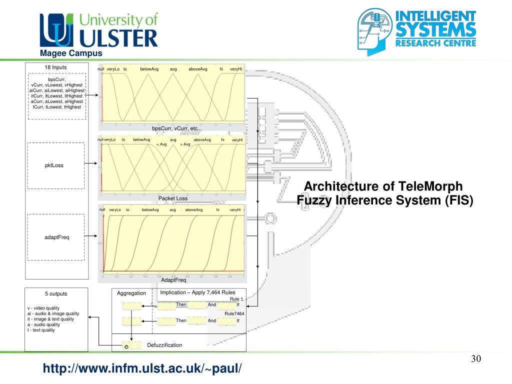 TeleMorph & TeleTuras:bandwidth determined mobile multimodal presentation Tony Solon, Kevin Curran, Paul Mc Kevitt • Multimedia limitations of mobile networks, mobile device capabilities • User preferences on modalities • Transmoding between modalities with cross-modality adaptation • Use of Fuzzy (logic) Inference system (FIS) • TeleMorph platform & TeleTuras tourist application • Implemented with MATLAB • Applications in streaming media, computer networks, multimodal presentation