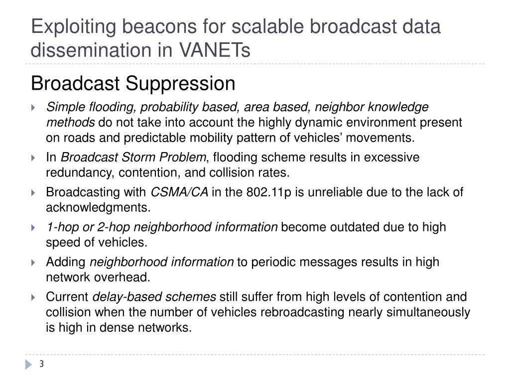 Exploiting beacons for scalable broadcast data dissemination in VANETs Broadcast Suppression • Simple flooding, probability based, area based, neighbor knowledge methods do not take into account the highly dynamic environment present on roadsand predictable mobility pattern of vehicles’ movements. • In Broadcast Storm Problem, flooding scheme results in excessive redundancy, contention, and collision rates. • Broadcasting with CSMA/CA in the 802.11p is unreliable due to the lack of acknowledgments. • 1-hop or 2-hop neighborhoodinformation become outdated due to high speed of vehicles. • Adding neighborhood information to periodic messages results in high network overhead. • Current delay-based schemes still suffer from high levels of contention and collision when the number of vehicles rebroadcasting nearly simultaneously is high in dense networks.