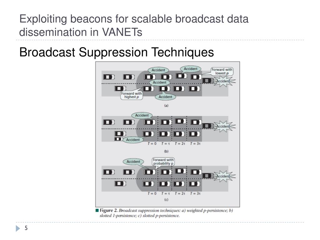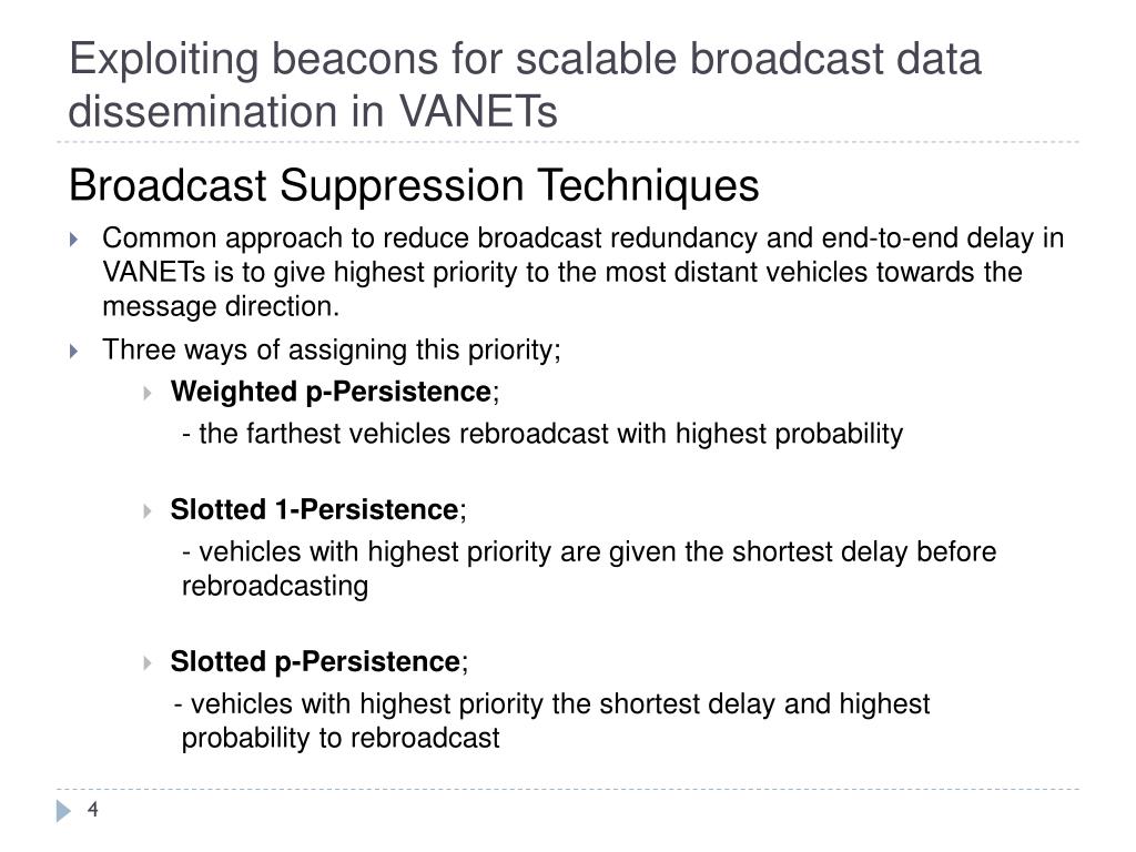 Exploiting beacons for scalable broadcast data dissemination in VANETs BroadcastSuppression Techniques • Common approach to reduce broadcast redundancy and end-to-end delay in VANETs is to give highest priority to the most distant vehicles towards the message direction. • Three ways of assigning this priority; • Weighted p-Persistence; - the farthest vehicles rebroadcast with highest probability • Slotted 1-Persistence; - vehicles with highest priority are given the shortest delay before rebroadcasting • Slotted p-Persistence; - vehicles with highest priority the shortest delay and highest probability to rebroadcast