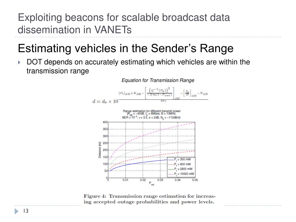 Exploiting beacons for scalable broadcast data dissemination in VANETs Estimating vehicles in the Sender’s Range • DOT depends on accurately estimating which vehicles are within the transmission range Equation for Transmission Range
