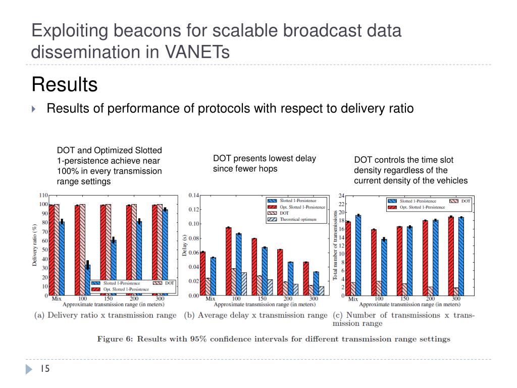 Exploiting beacons for scalable broadcast data dissemination in VANETs Results • Results of performance of protocols with respect to delivery ratio DOT and Optimized Slotted 1-persistence achieve near 100% in every transmission range settings DOT presents lowest delay since fewer hops DOT controls the time slot density regardless of the current density of the vehicles