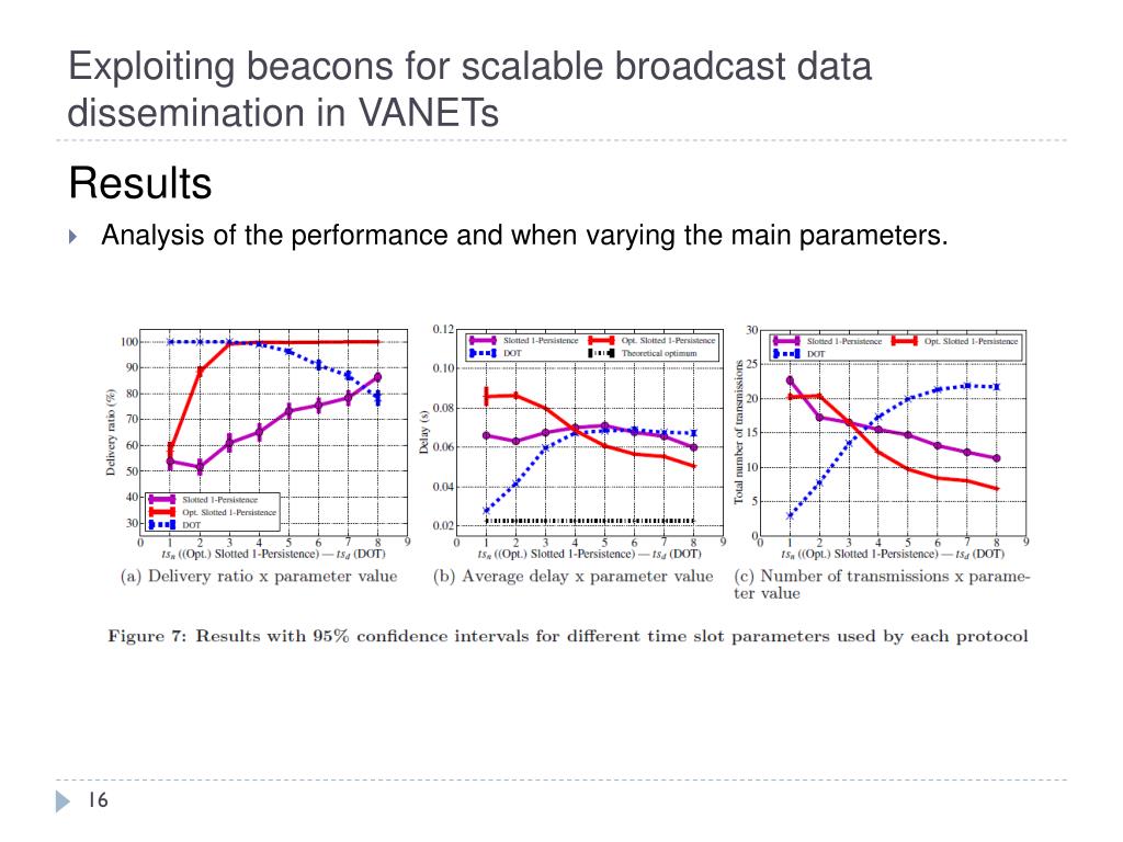 Exploiting beacons for scalable broadcast data dissemination in VANETs Results • Analysis of the performance and when varying the main parameters.