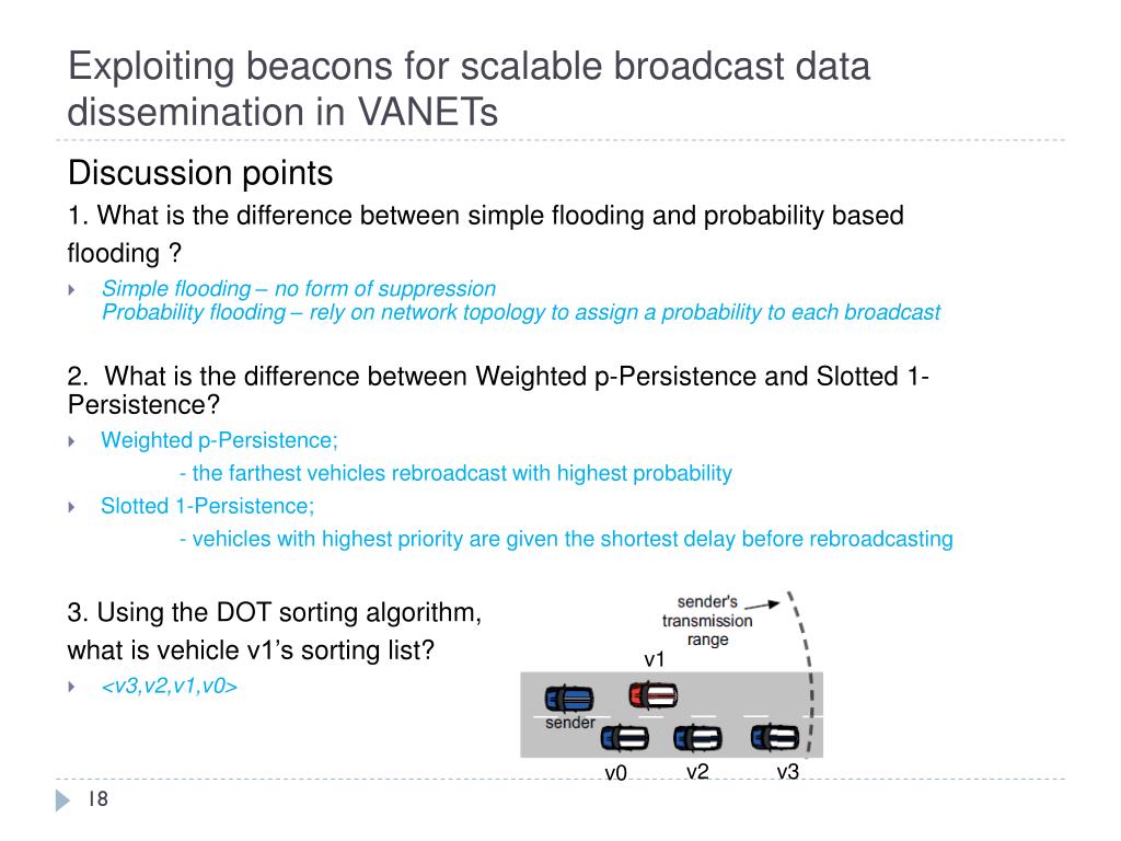 Exploiting beacons for scalable broadcast data dissemination in VANETs Discussion points 1. What is the difference between simple flooding and probability based flooding ? • Simple flooding – no form of suppressionProbability flooding – rely on network topology to assign a probability to each broadcast 2. What is the difference between Weighted p-Persistence and Slotted 1-Persistence? • Weighted p-Persistence; - the farthest vehicles rebroadcast with highest probability • Slotted 1-Persistence; - vehicles with highest priority are given the shortest delay before rebroadcasting 3. Using the DOT sorting algorithm, what is vehicle v1’s sorting list? • <v3,v2,v1,v0> v1 v2 v3 v0