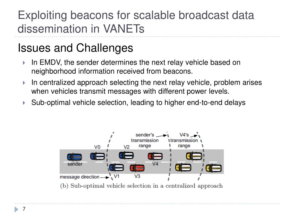Exploiting beacons for scalable broadcast data dissemination in VANETs Issues and Challenges • In EMDV, the sender determines the next relay vehicle based on neighborhood information received from beacons. • In centralized approach selecting the next relay vehicle, problem arises when vehicles transmit messages with different power levels. • Sub-optimal vehicle selection, leading to higher end-to-end delays
