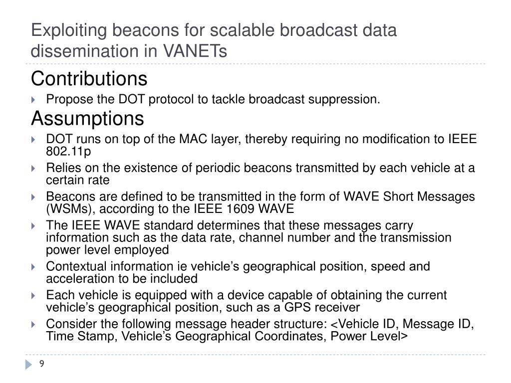 Exploiting beacons for scalable broadcast data dissemination in VANETs Contributions • Propose the DOT protocol to tackle broadcast suppression. Assumptions • DOT runs on top of the MAC layer, thereby requiring no modification to IEEE 802.11p • Relies on the existence of periodic beacons transmitted by each vehicle at a certain rate • Beacons are defined to be transmitted in the form of WAVE Short Messages (WSMs), according to the IEEE 1609 WAVE • The IEEE WAVE standard determines that these messages carry information such as the data rate, channel number and the transmission power level employed • Contextual information ie vehicle’s geographical position, speed and acceleration to be included • Each vehicle is equipped with a device capable of obtaining the current vehicle’s geographical position, such as a GPS receiver • Consider the following message header structure: <Vehicle ID, Message ID, Time Stamp, Vehicle’s Geographical Coordinates, Power Level>