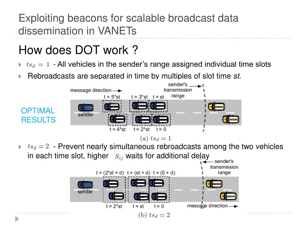 Exploiting beacons for scalable broadcast data dissemination in VANETs How does DOT work ? • - All vehicles in the sender’s range assigned individual time slots • Rebroadcasts are separated in time by multiples of slot time st. • - Prevent nearly simultaneous rebroadcasts among the two vehicles in each time slot, higher waits for additional delay OPTIMAL RESULTS
