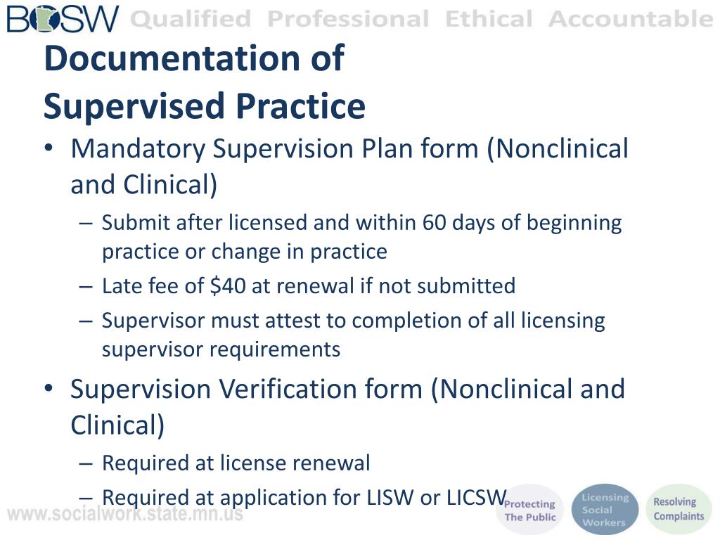 Documentation of Supervised Practice • Mandatory Supervision Plan form (Nonclinical and Clinical) • Submit after licensed and within 60 days of beginning practice or change in practice • Late fee of $40 at renewal if not submitted • Supervisor must attest to completion of all licensing supervisor requirements • Supervision Verification form (Nonclinical and Clinical) • Required at license renewal • Required at application for LISW or LICSW