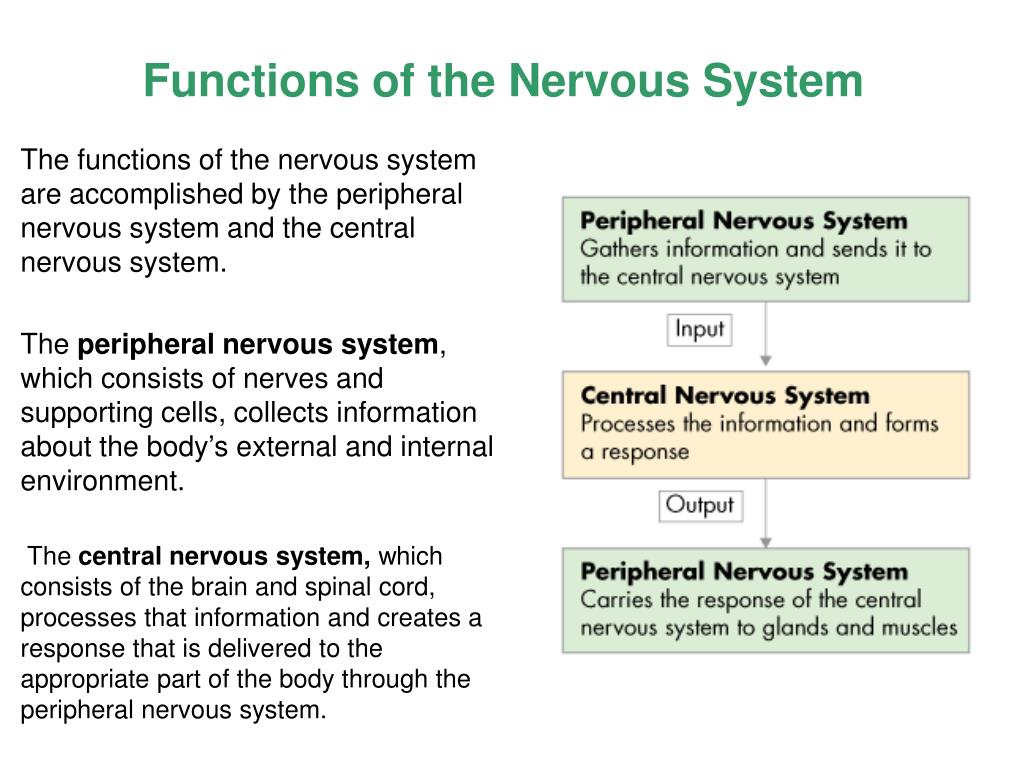Functions of the Nervous System The functions of the nervous system are accomplished by the peripheral nervous system and the central nervous system. The peripheral nervous system, which consists of nerves and supporting cells, collects information about the body’s external and internal environment. The central nervous system, which consists of the brain and spinal cord, processes that information and creates a response that is delivered to the appropriate part of the body through the peripheral nervous system.