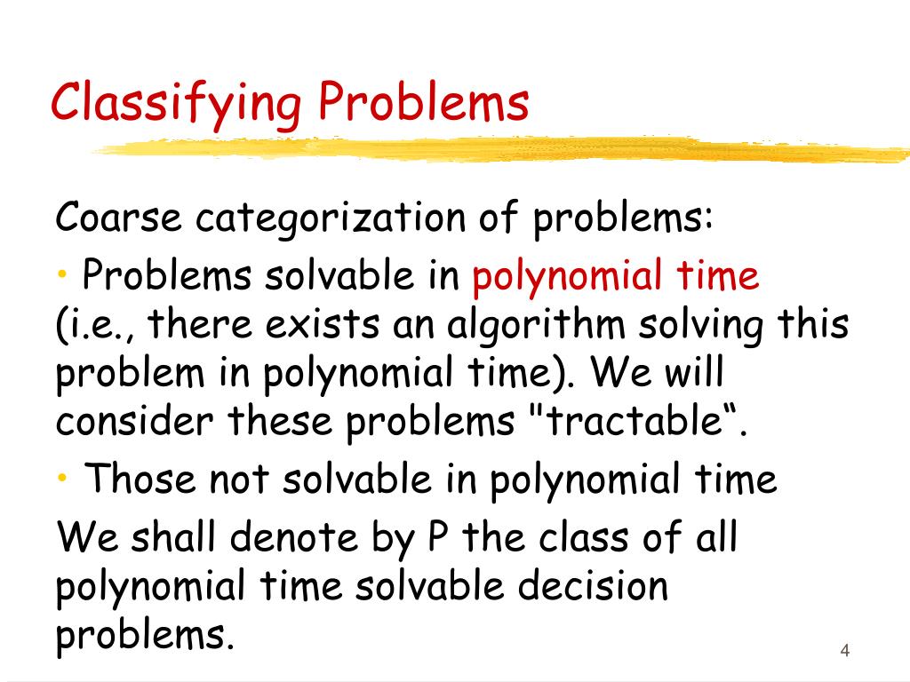 Classifying Problems Coarse categorization of problems: • Problems solvable in polynomial time (i.e., there exists an algorithm solving this problem in polynomial time). We will consider these problems "tractable“. • Those not solvable in polynomial time We shall denote by P the class of all polynomial time solvable decision problems.