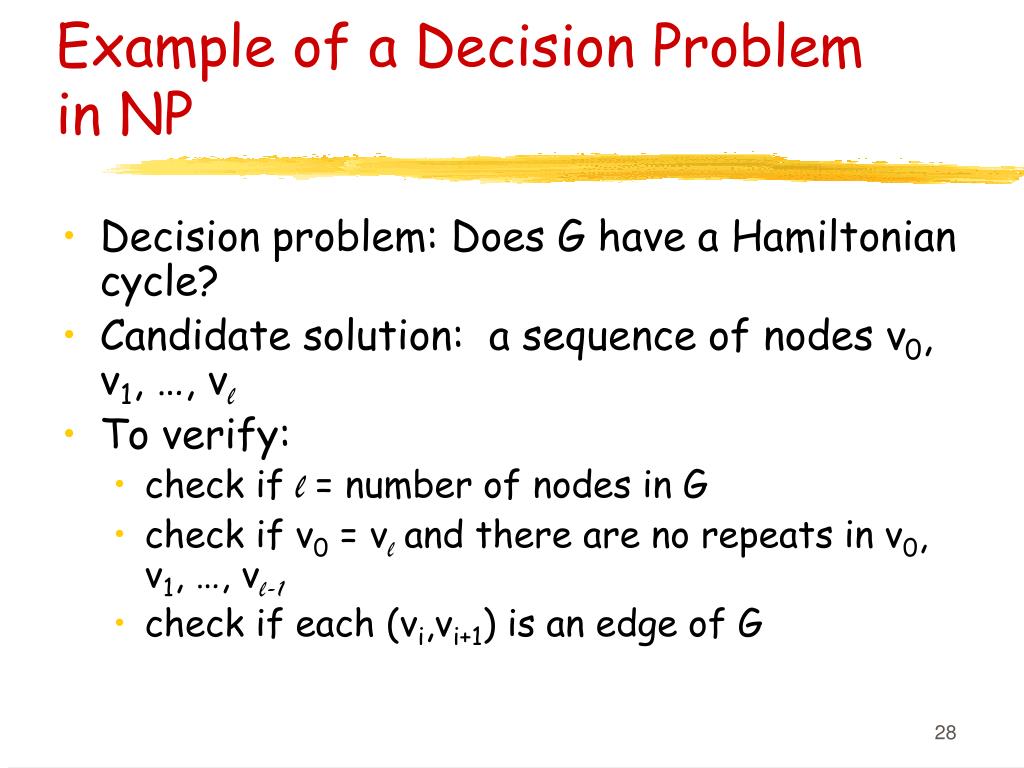 Example of a Decision Problem in NP • Decision problem: Does G have a Hamiltonian cycle? • Candidate solution: a sequence of nodes v0, v1, …, vl • To verify: • check if l = number of nodes in G • check if v0 = vl and there are no repeats in v0, v1, …, vl-1 • check if each (vi,vi+1) is an edge of G