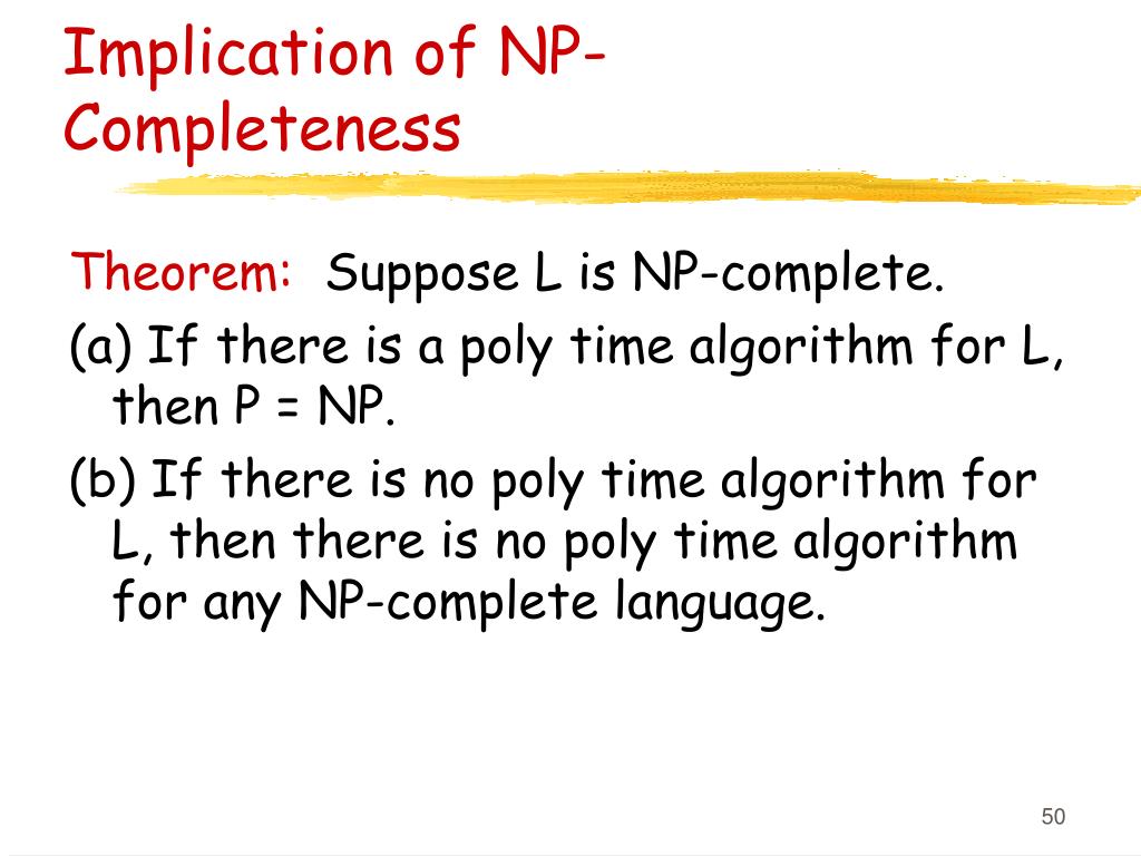 Implication of NP-Completeness Theorem: Suppose L is NP-complete. (a) If there is a poly time algorithm for L, then P = NP. (b) If there is no poly time algorithm for L, then there is no poly time algorithm for any NP-complete language.