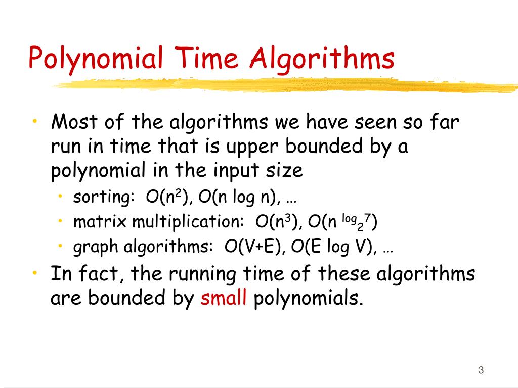 Polynomial Time Algorithms • Most of the algorithms we have seen so far run in time that is upper bounded by a polynomial in the input size • sorting: O(n2), O(n log n), … • matrix multiplication: O(n3), O(n log27) • graph algorithms: O(V+E), O(E log V), … • In fact, the running time of these algorithms are bounded by small polynomials.