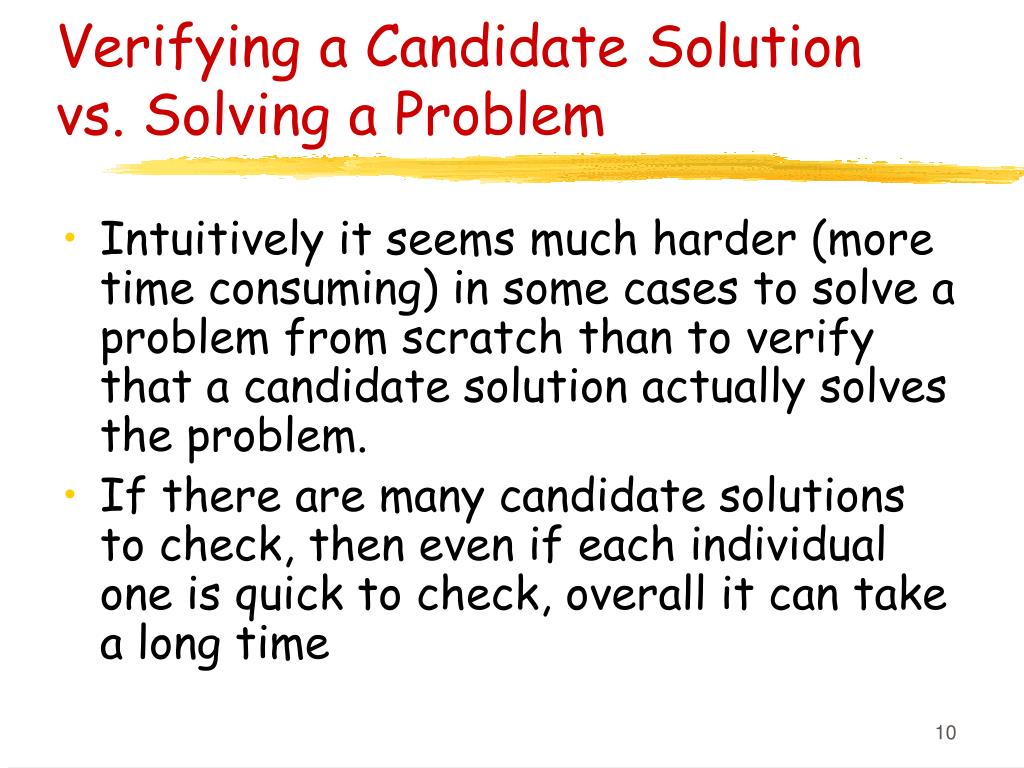 Verifying a Candidate Solution vs. Solving a Problem • Intuitively it seems much harder (more time consuming) in some cases to solve a problem from scratch than to verify that a candidate solution actually solves the problem. • If there are many candidate solutions to check, then even if each individual one is quick to check, overall it can take a long time