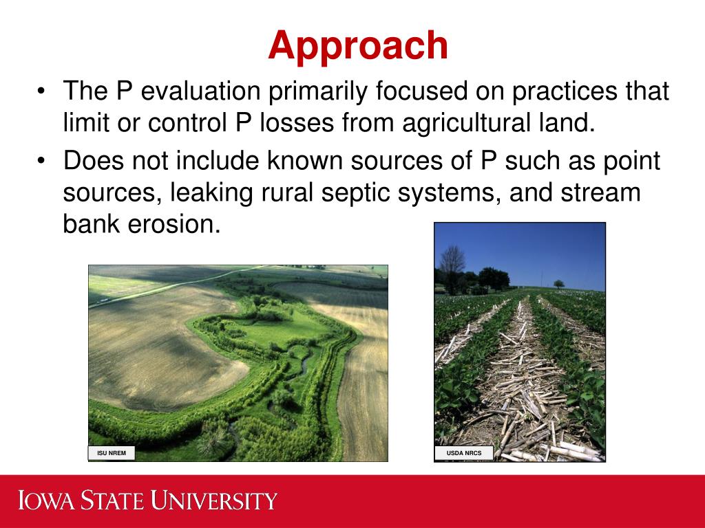 Approach • The P evaluation primarily focused on practices that limit or control P losses from agricultural land. • Does not include known sources of P such as point sources, leaking rural septic systems, and stream bank erosion. ISU NREM USDA NRCS