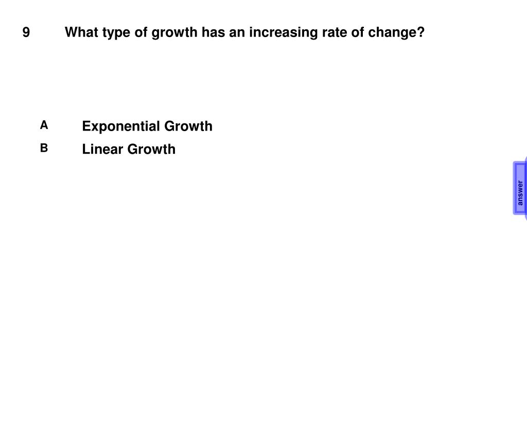 9 What type of growth has an increasing rate of change? A Exponential Growth B Linear Growth answer A