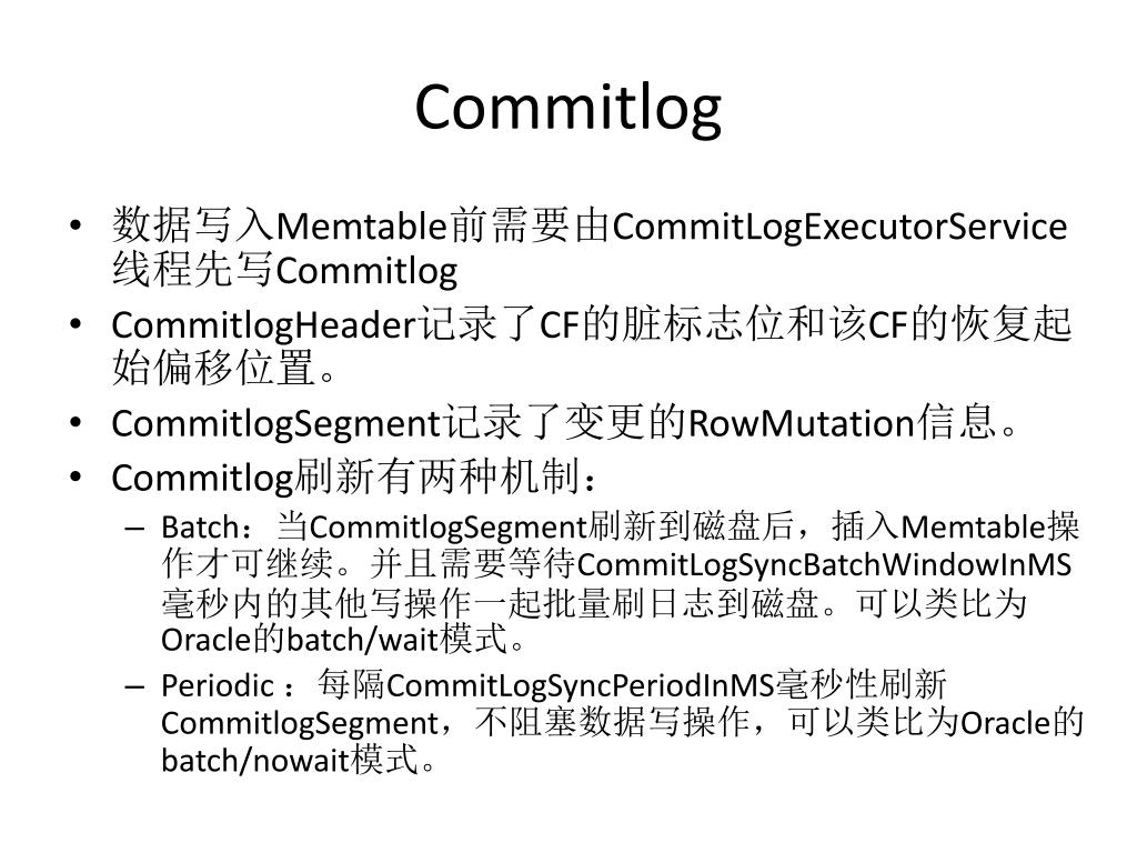 Commitlog • 数据写入Memtable前需要由CommitLogExecutorService线程先写Commitlog • CommitlogHeader记录了CF的脏标志位和该CF的恢复起始偏移位置。 • CommitlogSegment记录了变更的RowMutation信息。 • Commitlog刷新有两种机制: • Batch:当CommitlogSegment刷新到磁盘后,插入Memtable操作才可继续。并且需要等待CommitLogSyncBatchWindowInMS毫秒内的其他写操作一起批量刷日志到磁盘。可以类比为Oracle的batch/wait模式。 • Periodic :每隔CommitLogSyncPeriodInMS毫秒性刷新CommitlogSegment,不阻塞数据写操作,可以类比为Oracle的batch/nowait模式。