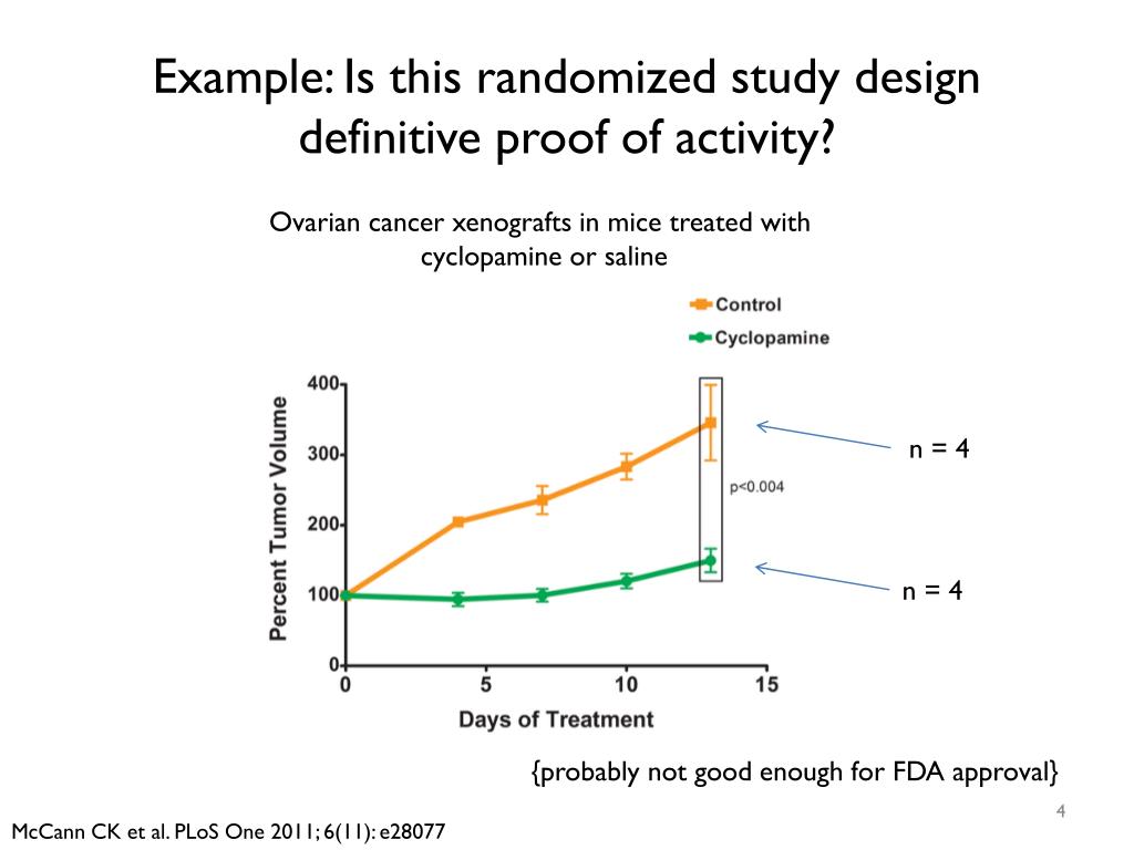 Example: Is this randomized study design definitive proof of activity? Ovarian cancer xenografts in mice treated with cyclopamine or saline n = 4 n = 4 {probably not good enough for FDA approval} McCann CK et al. PLoS One 2011; 6(11): e28077