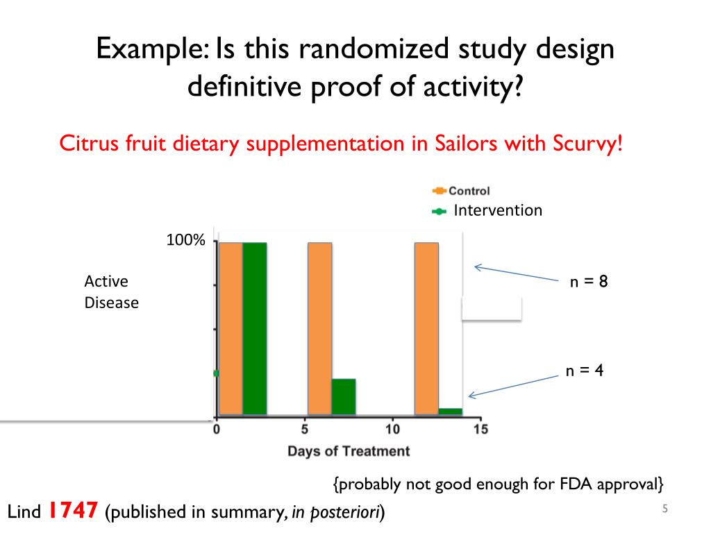 Example: Is this randomized study design definitive proof of activity? Citrus fruit dietary supplementation in Sailors with Scurvy! Intervention 100% Active Disease n = 8 n = 4 {probably not good enough for FDA approval} Lind1747 (published in summary, in posteriori)
