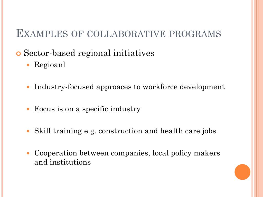 Examples of collaborativeprograms • Sector-basedregionalinitiatives • Regioanl • Industry-focusedapproaces to workforcedevelopment • Focus is on a specificindustry • Skilltraininge.g. construction and healthcarejobs • Cooperationbetweencompanies, localpolicymakers and institutions