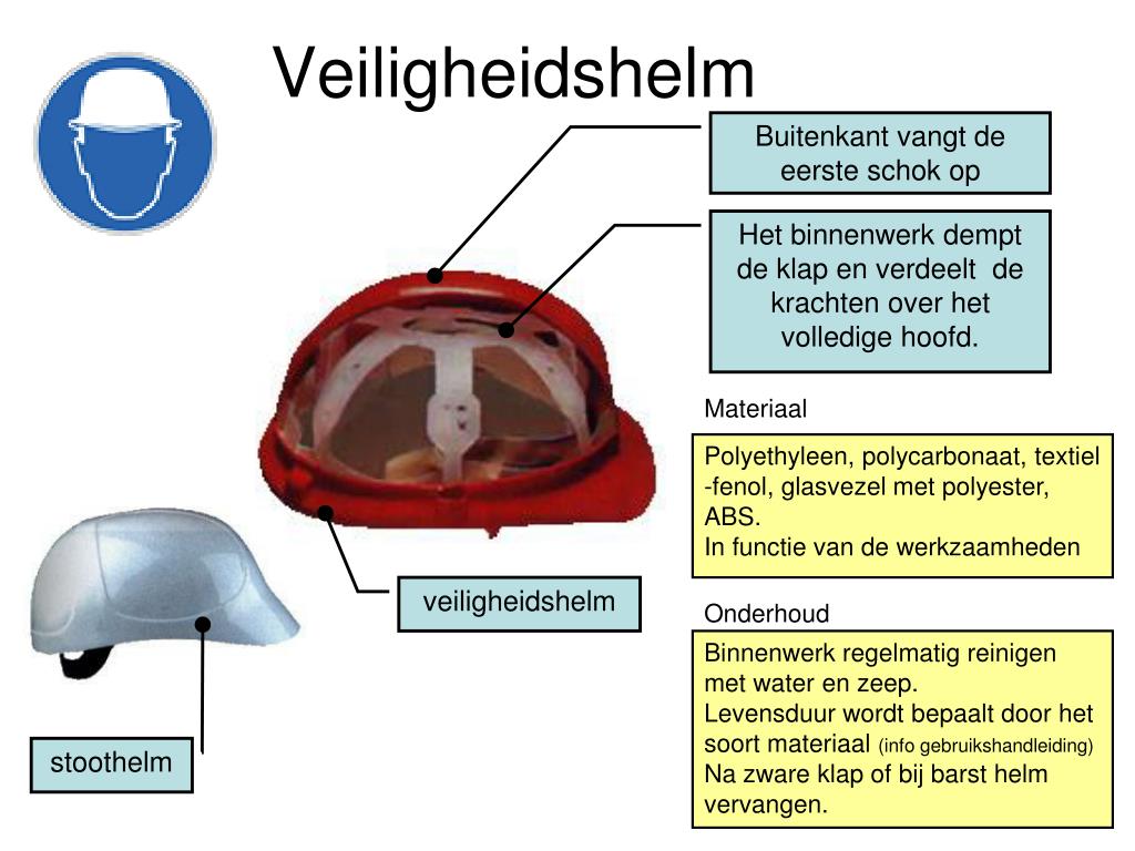 Veiligheidshelm Buitenkant vangt de eerste schok op Het binnenwerk dempt de klap en verdeelt de krachten over het volledige hoofd. Materiaal Polyethyleen, polycarbonaat, textiel -fenol, glasvezel met polyester, ABS. In functie van de werkzaamheden veiligheidshelm Onderhoud Binnenwerk regelmatig reinigen met water en zeep.Levensduur wordt bepaalt door het soort materiaal (info gebruikshandleiding)Na zware klap of bij barst helm vervangen. stoothelm