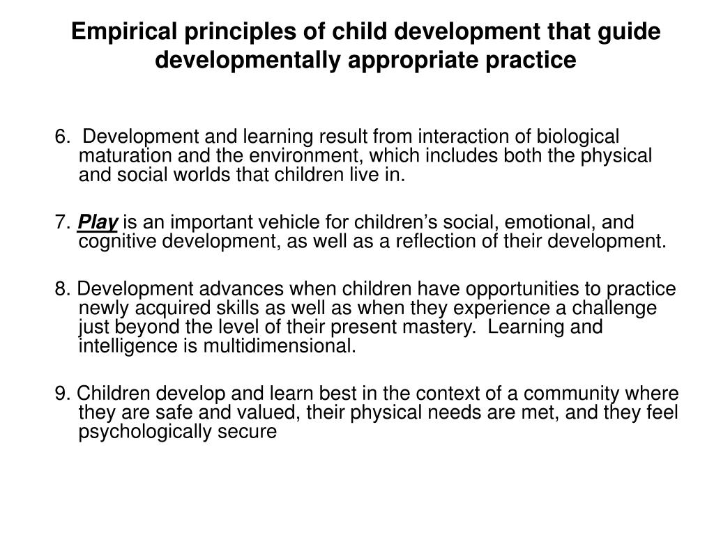Empirical principles of child development that guide developmentally appropriate practice 6. Development and learning result from interaction of biological maturation and the environment, which includes both the physical and social worlds that children live in. 7. Play is an important vehicle for children’s social, emotional, and cognitive development, as well as a reflection of their development. 8. Development advances when children have opportunities to practice newly acquired skills as well as when they experience a challenge just beyond the level of their present mastery. Learning and intelligence is multidimensional. 9. Children develop and learn best in the context of a community where they are safe and valued, their physical needs are met, and they feel psychologically secure