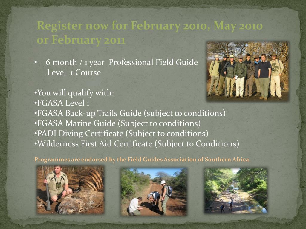 Register now for February 2010, May 2010 or February 2011 • 6 month / 1 year Professional Field Guide • Level 1 Course • You will qualify with: • FGASA Level 1 • FGASA Back-up Trails Guide (subject to conditions) • FGASA Marine Guide (Subject to conditions) • PADI Diving Certificate (Subject to conditions) • Wilderness First Aid Certificate (Subject to Conditions) • Programmes are endorsed by the Field Guides Association of Southern Africa.