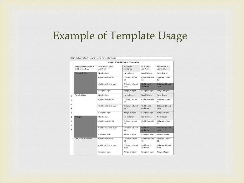 Considerations in Constructing the Framework • Need to understand individual experience within the context of the family. • Need for flexibility in terms of how “the family” is defined. • Recognition of the gendered nature of immigration and settlement and the need for measurements that reflect these differences.
