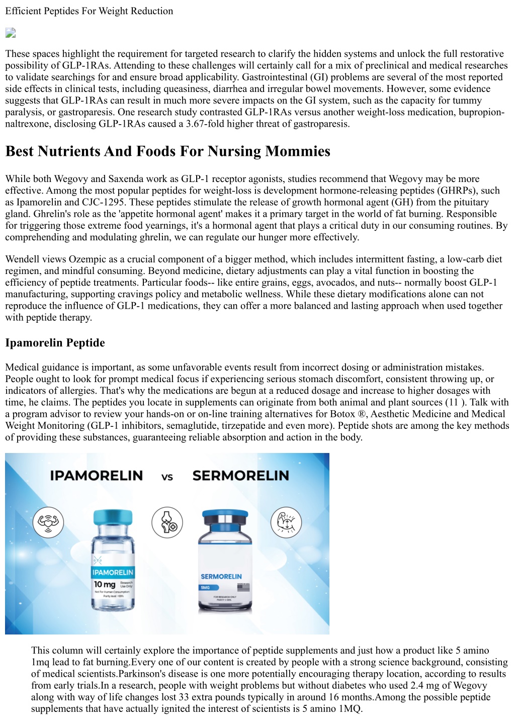 Efficient Peptides For Weight Reduction These spaces highlight the requirement for targeted research to clarify the hidden systems and unlock the full restorative possibility of GLP-1RAs. Attending to these challenges will certainly call for a mix of preclinical and medical researches to validate searchings for and ensure broad applicability. Gastrointestinal (GI) problems are several of the most reported side effects in clinical tests, including queasiness, diarrhea and irregular bowel movements. However, some evidence suggests that GLP-1RAs can result in much more severe impacts on the GI system, such as the capacity for tummy paralysis, or gastroparesis. One research study contrasted GLP-1RAs versus another weight-loss medication, bupropion- naltrexone, disclosing GLP-1RAs caused a 3.67-fold higher threat of gastroparesis. Best Nutrients And Foods For Nursing Mommies While both Wegovy and Saxenda work as GLP-1 receptor agonists, studies recommend that Wegovy may be more effective. Among the most popular peptides for weight-loss is development hormone-releasing peptides (GHRPs), such as Ipamorelin and CJC-1295. These peptides stimulate the release of growth hormonal agent (GH) from the pituitary gland. Ghrelin's role as the 'appetite hormonal agent' makes it a primary target in the world of fat burning. Responsible for triggering those extreme food yearnings, it's a hormonal agent that plays a critical duty in our consuming routines. By comprehending and modulating ghrelin, we can regulate our hunger more effectively. Wendell views Ozempic as a crucial component of a bigger method, which includes intermittent fasting, a low-carb diet regimen, and mindful consuming. Beyond medicine, dietary adjustments can play a vital function in boosting the efficiency of peptide treatments. Particular foods-- like entire grains, eggs, avocados, and nuts-- normally boost GLP-1 manufacturing, supporting cravings policy and metabolic wellness. While these dietary modifications alone can not reproduce the influence of GLP-1 medications, they can offer a more balanced and lasting approach when used together with peptide therapy. Ipamorelin Peptide Medical guidance is important, as some unfavorable events result from incorrect dosing or administration mistakes. People ought to look for prompt medical focus if experiencing serious stomach discomfort, consistent throwing up, or indicators of allergies. That's why the medications are begun at a reduced dosage and increase to higher dosages with time, he claims. The peptides you locate in supplements can originate from both animal and plant sources (11 ). Talk with a program advisor to review your hands-on or on-line training alternatives for Botox ®, Aesthetic Medicine and Medical Weight Monitoring (GLP-1 inhibitors, semaglutide, tirzepatide and even more). Peptide shots are among the key methods of providing these substances, guaranteeing reliable absorption and action in the body. This column will certainly explore the importance of peptide supplements and just how a product like 5 amino 1mq lead to fat burning.Every one of our content is created by people with a strong science background, consisting of medical scientists.Parkinson's disease is one more potentially encouraging therapy location, according to results from early trials.In a research, people with weight problems but without diabetes who used 2.4 mg of Wegovy along with way of life changes lost 33 extra pounds typically in around 16 months.Among the possible peptide supplements that have actually ignited the interest of scientists is 5 amino 1MQ.