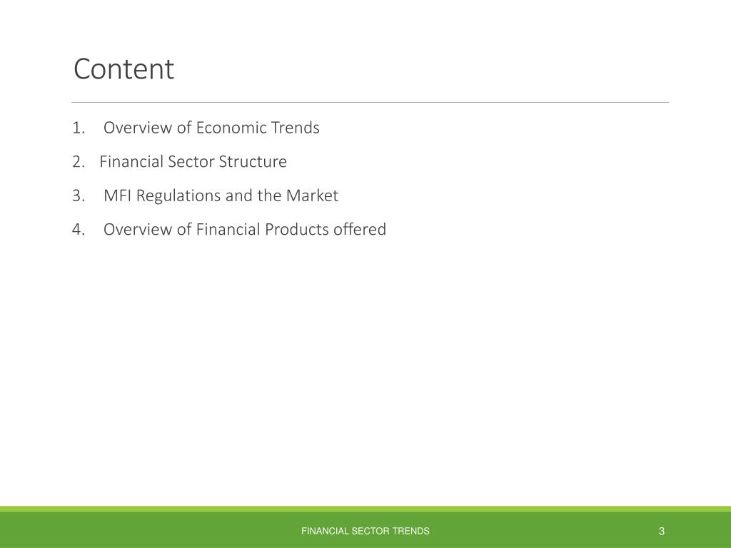 Content • Overview of Economic Trends • Financial Sector Structure • MFI Regulations and the Market • Overview of Financial Products offered Financial Sector trends