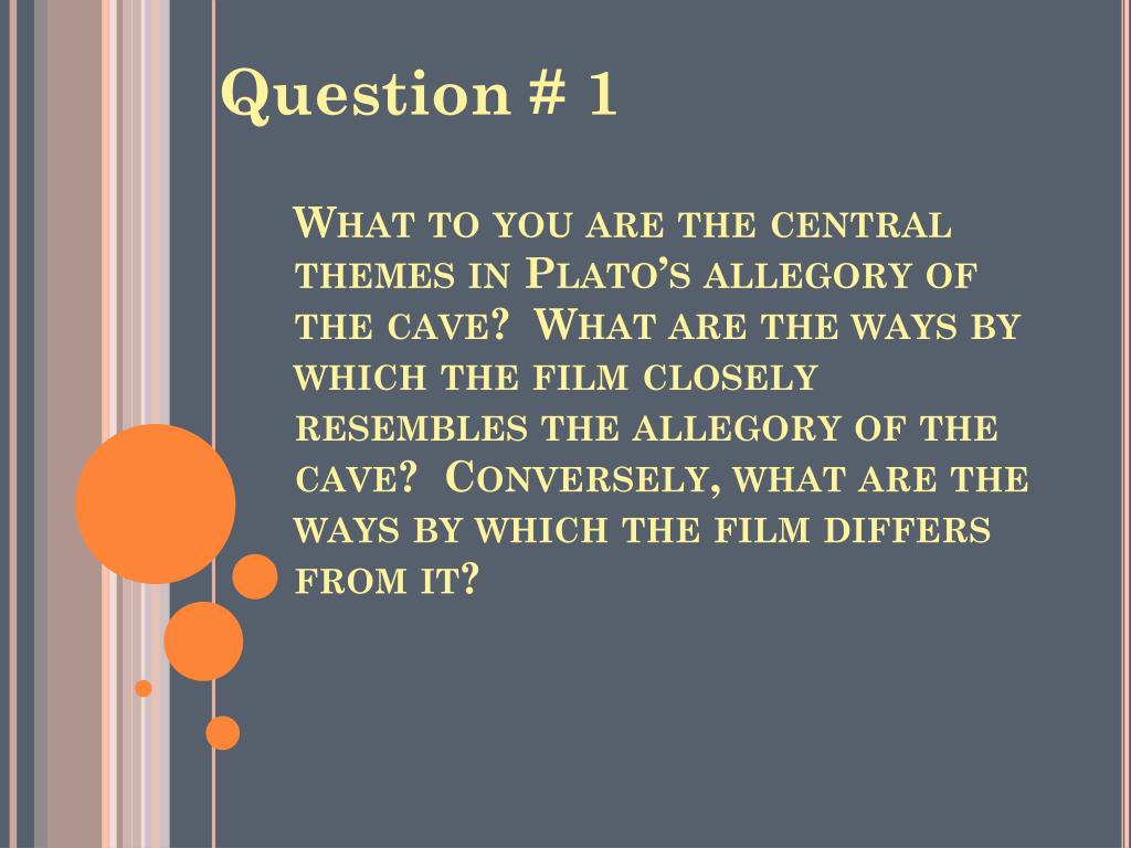 What to you are the central themes in Plato’s allegory of the cave? What are the ways by which the film closely resembles the allegory of the cave? Conversely, what are the ways by which the film differs from it? Question # 1