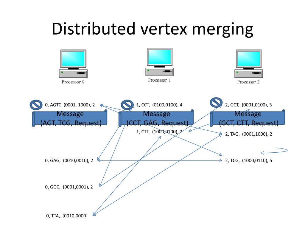 Distributed vertex merging 2, GCTT (1000,0100), 5 0, AGTC (0001, 1000), 4 1, CCTC, (0010,0100), 6 Message (GCT, TTA, Request) Message (CCT, TCG, Request) 2, TAG, (0001,1000), 2 2, TCG, (1000,0110), 5 0, GGC, (0001,0001), 2 Message (GGC, CCT, Request) 0, TTA, (0010,0000)