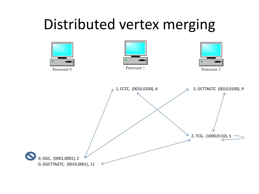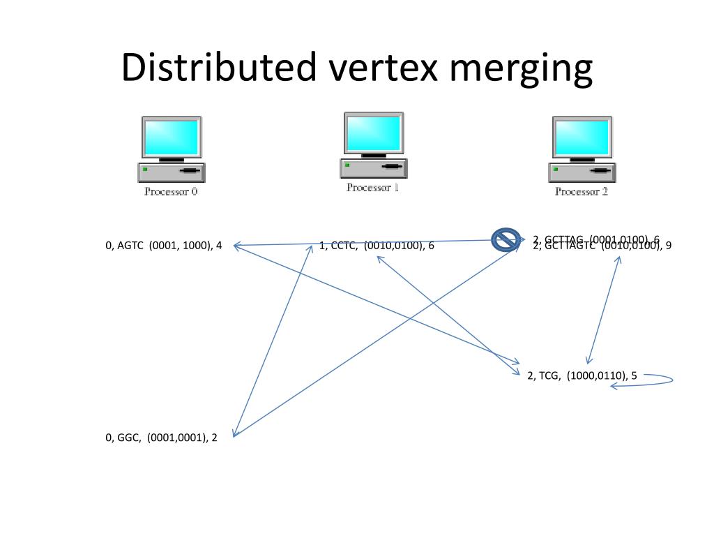 Distributed vertex merging 0, AGT (0100,1000), 2 0, AGTC (0001, 1000), 2 1, CCT, (0100,0100), 4 2, GCT, (0001,0100), 3 1, CTT, (1000,0100), 2 2, TAG, (0001,1000), 2 0, GTC, (0010,0001), 2 0, GAG, (0010,0010), 2 2, TCG, (1000,0110), 5 0, GGC, (0001,0001), 2 0, TTA, (0010,0000)