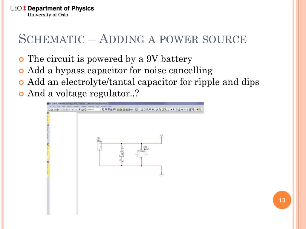Schematic – Adding a powersource • The circuit is powered by a 9V battery • Add a bypasscapacitor for noisecancelling • Add an electrolyte/tantal capacitor for ripple and dips • And a voltage regulator..?