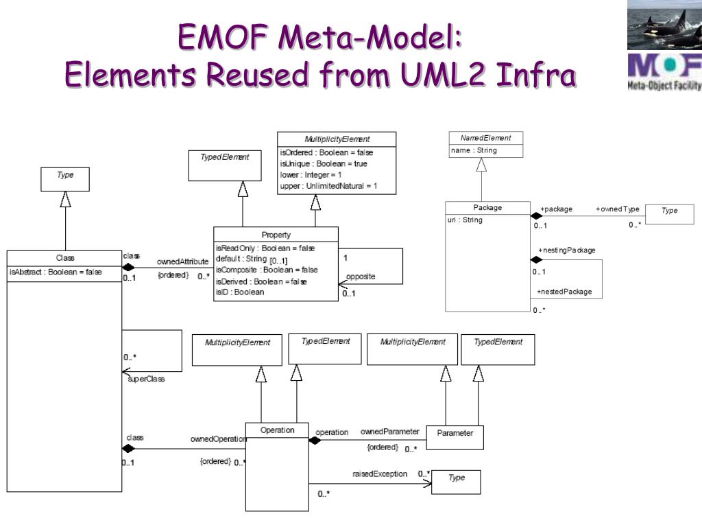 EMOF Meta-Model: Elements Absent from UML2 Infra • Reflection package: • Views any model element as an instance of a meta-model meta-class • Provide operations that cut across MDA layers to manipulate model and meta-model elements as meta-objects of their meta-classes • Provides meta-meta-model of a generic reflective API to programmatically manipulate models