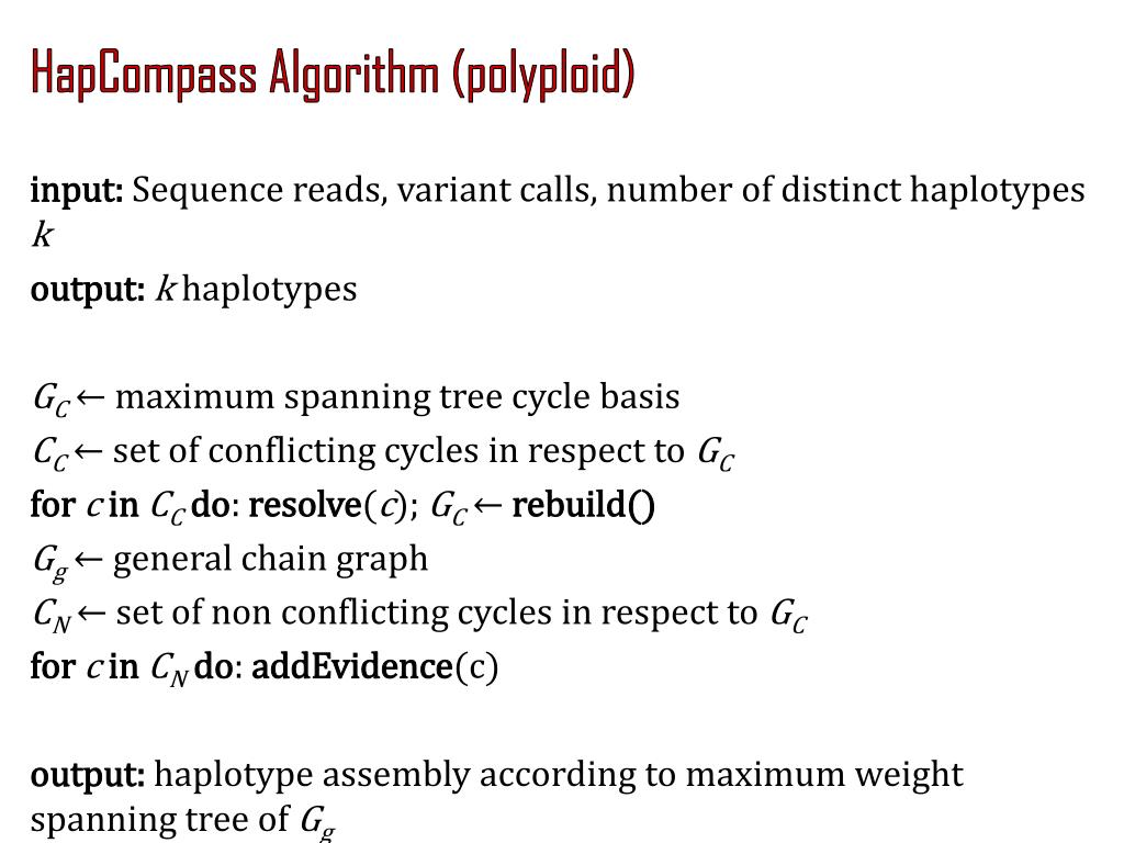 HapCompass Algorithm (polyploid) input: Sequence reads, variant calls, number of distinct haplotypes k output: k haplotypes GC← maximum spanning tree cycle basis CC ← set of conflicting cycles in respect to GC forcinCCdo: resolve(c); GC← rebuild() Gg← general chain graph CN← set of non conflicting cycles in respect to GC forcinCNdo: addEvidence(c) output: haplotype assembly according to maximum weight spanning tree of Gg
