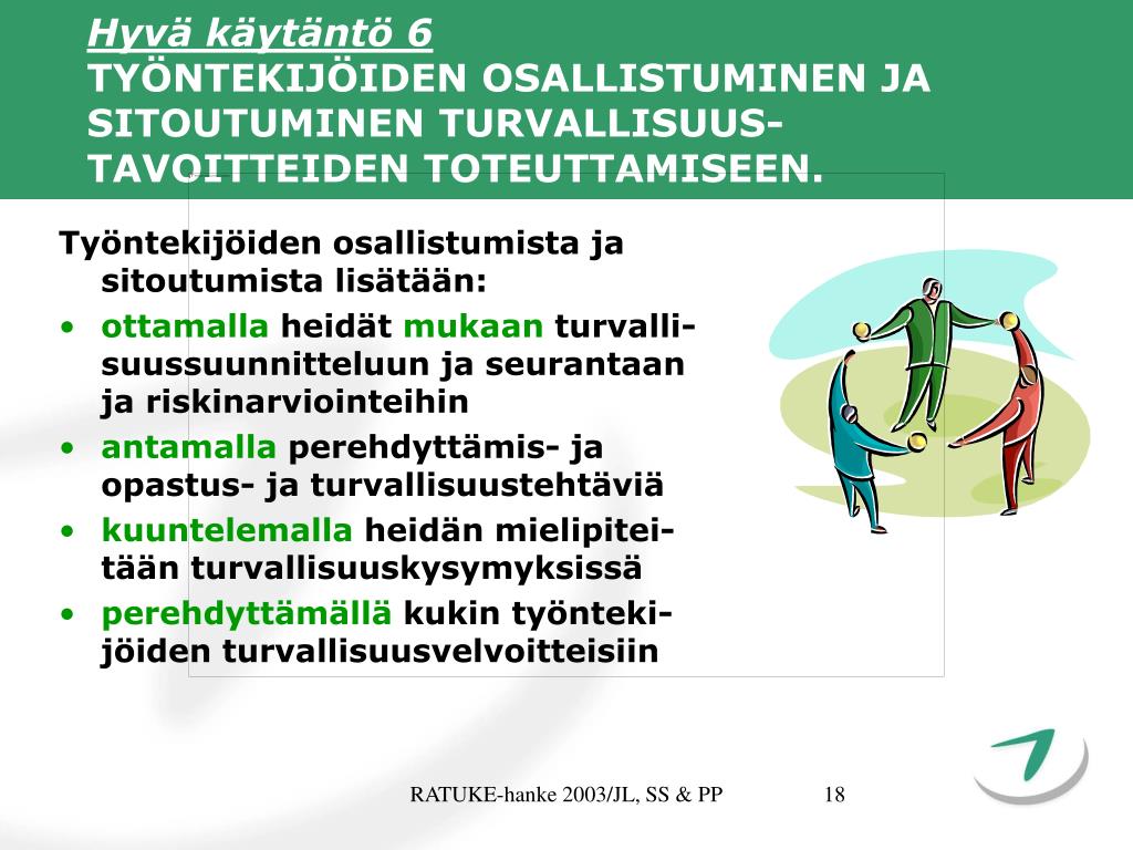 Hyvä käytäntö 6TYÖNTEKIJÖIDEN OSALLISTUMINEN JA SITOUTUMINEN TURVALLISUUS-TAVOITTEIDEN TOTEUTTAMISEEN. Työntekijöiden osallistumista ja sitoutumista lisätään: • ottamalla heidät mukaan turvalli-suussuunnitteluun ja seurantaan ja riskinarviointeihin • antamalla perehdyttämis- ja opastus- ja turvallisuustehtäviä • kuuntelemalla heidän mielipitei-tään turvallisuuskysymyksissä • perehdyttämällä kukin työnteki-jöiden turvallisuusvelvoitteisiin RATUKE-hanke 2003/JL, SS & PP