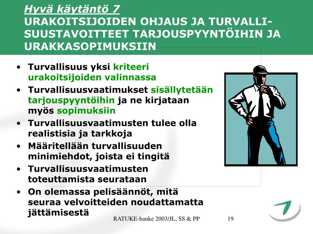 Hyvä käytäntö 1JOHDON SITOUTUMINEN TURVALLISUUDEN KEHITTÄMISEEN JA SEN OSOITTAMINEN. • Rakennusyrityksen johto asettaa rakennushankkeelle turvallisuus-päämäärän ja yksityiskohtaiset tavoitteet. • Yrityksen johto ja myös työmaa-johto osallistuu aika ajoin käytän-nön turvallisuustoimintaan ja näyttää henkilökohtaista esimerkkiä suojavälineiden käytössä. • Johto puuttuu aktiivisesti havaitsemiinsa turvallisuus-puutteisiin. RATUKE-hanke 2003/JL, SS & PP