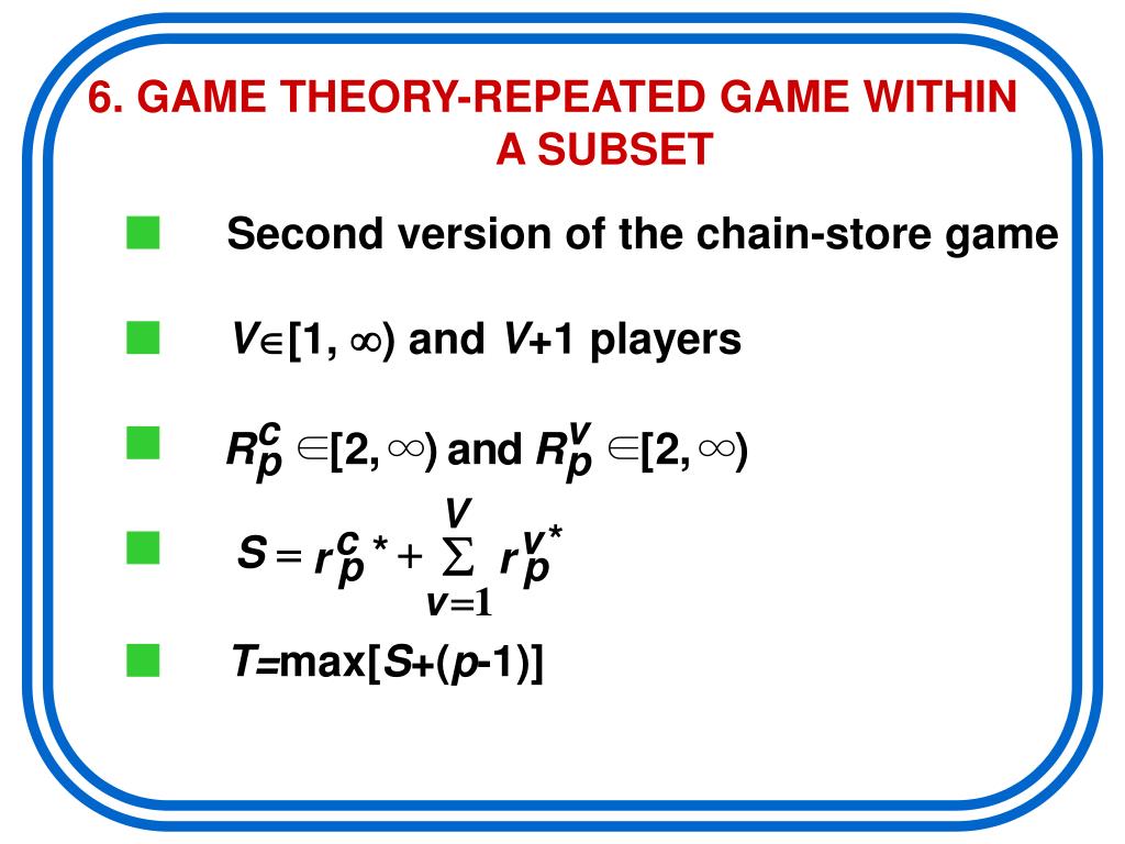 6. GAME THEORY-REPEATED GAME WITHIN A SUBSET Second version of the chain-store game V[1, ) and V+1 players T=max[S+(p-1)]