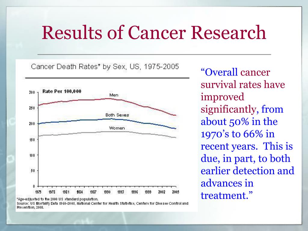 Results of Cancer Research “Overall cancer survival rates have improved significantly, from about 50% in the 1970’s to 66% in recent years. This is due, in part, to both earlier detection and advances in treatment.”