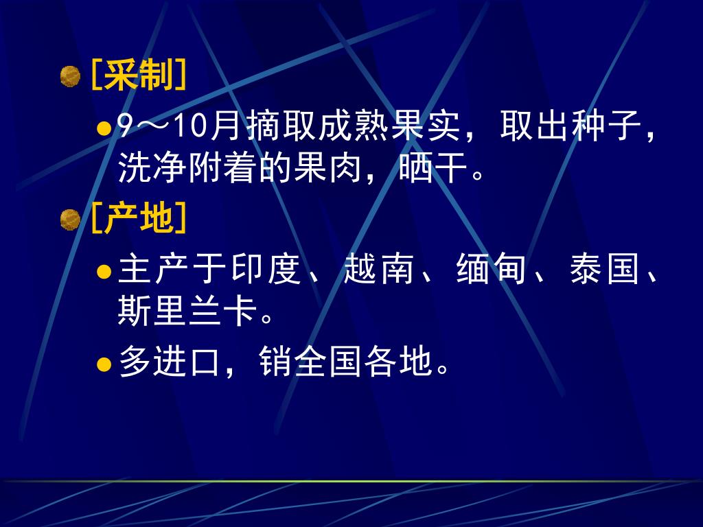 [采制] • 9~10月摘取成熟果实,取出种子,洗净附着的果肉,晒干。 • [产地] • 主产于印度、越南、缅甸、泰国、斯里兰卡。 • 多进口,销全国各地。