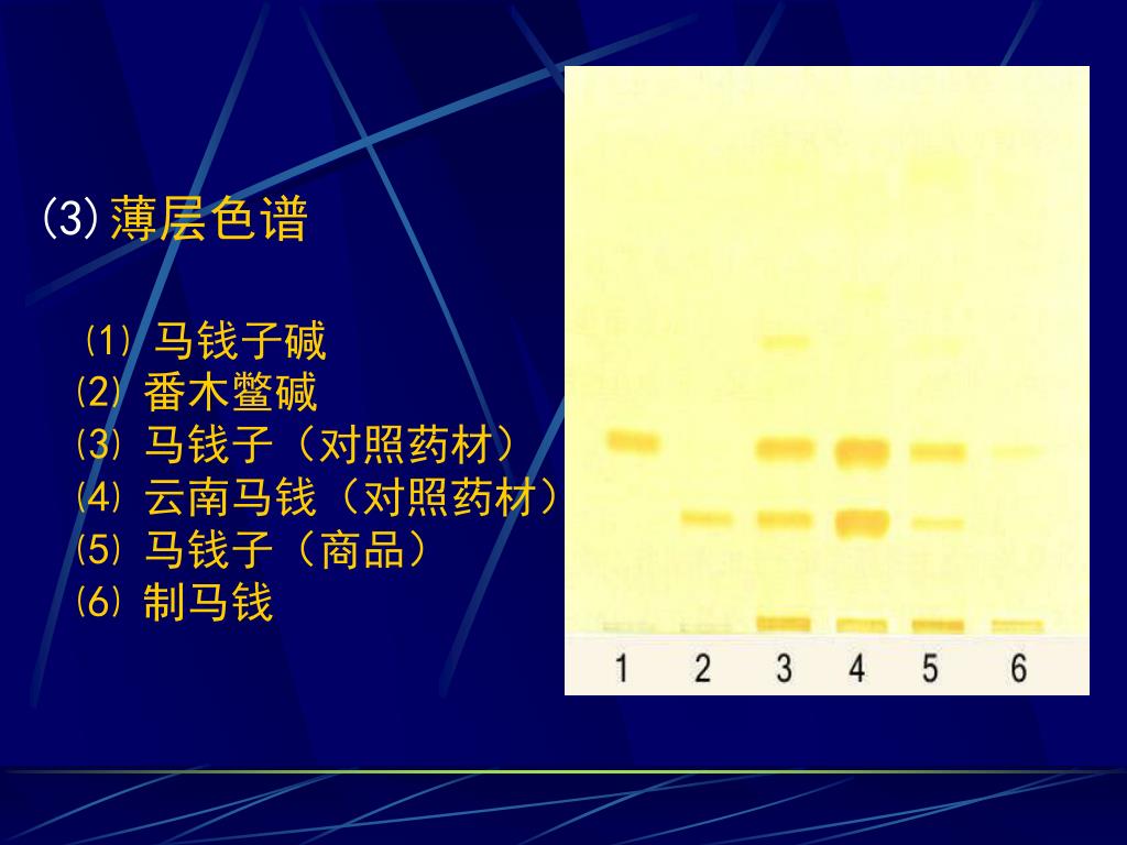 (3)薄层色谱 ⑴ 马钱子碱 ⑵ 番木鳖碱 ⑶ 马钱子(对照药材) ⑷ 云南马钱(对照药材) ⑸ 马钱子(商品) ⑹ 制马钱