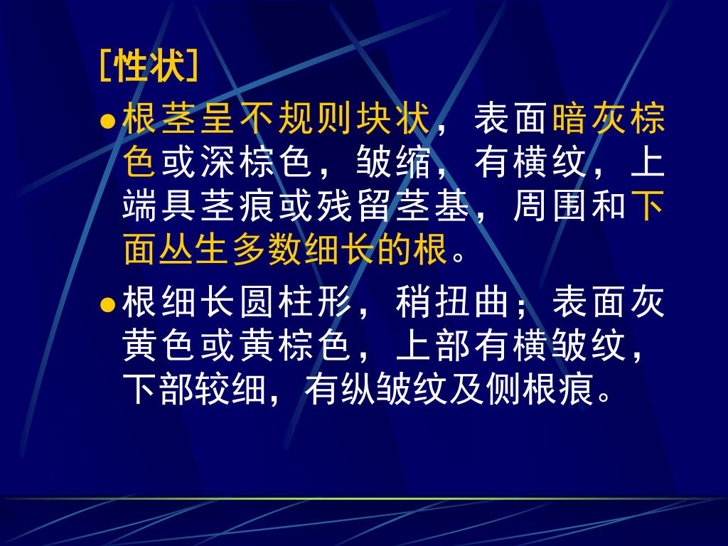 [性状] • 根茎呈不规则块状,表面暗灰棕色或深棕色,皱缩,有横纹,上端具茎痕或残留茎基,周围和下面丛生多数细长的根。 • 根细长圆柱形,稍扭曲;表面灰黄色或黄棕色,上部有横皱纹,下部较细,有纵皱纹及侧根痕。