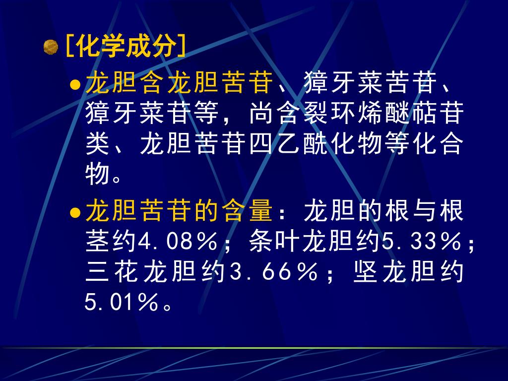 [化学成分] • 龙胆含龙胆苦苷、獐牙菜苦苷、獐牙菜苷等,尚含裂环烯醚萜苷类、龙胆苦苷四乙酰化物等化合物。 • 龙胆苦苷的含量:龙胆的根与根茎约4.08%;条叶龙胆约5.33%;三花龙胆约3.66%;坚龙胆约5.01%。